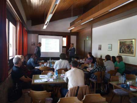 Ve čtvrtek nás uvítal Michael Gruber – tajemník italského svazu chovatelů haflingů v Bolzanu v sídle svazů všech hospodářských zvířat. Začali jsme celodenním seminářem pod vedením Dr. G. Pigozziho – ředitele italského svazu chovatelů haflingů a Dr. A. Sgambatiho – hlavního koordinátora italských hodnotitelů. Seznámili nás s historií vzniku a chovu plemene hafling a přiblížili nám všechny změny, které tyto koníky za více než stoletou historii potkaly. Ať už se jedná o soumarské využití ve vojenství nebo následně v zemědělství, či překvapivě žádaný chov na maso v 60. letech. Zajímavostí pro nás bylo, že v r. 1931 Peter Pauli založil oficiální plemennou knihu tvořenou třemi stovkami chovných koní tmavé až hnědé barvy, ovšem exteriérově byl hafling velmi podobný dnešnímu „modernímu typu“ s ušlechtilou hlavou a výrazným okem! Toť pro nás bylo překvapivé, jelikož dosud u nás panoval názor, že dnešní ušlechtilý hafling je zcela jiný než za dávných časů. Tento klam byl způsoben dočasnou poptávkou po koňském mase v druhé polovině minulého století, která si vyžádala i v plemenitbě kladení důrazu na výraznou zmasilost napodobující až chladnokrevné koně, což trvalo až do konce 80. let. Pak se hafling zpět začal zušlechťovat k původnímu koni pro volnočasové, všestranné využití a v r. 1990 byl zaveden nový způsob zapisování do chovu pomocí lineárního popisu a bodové stupnice. Získaná data jsou dnes zpracovávána metodou BLUP (best linear unibased prediction), a tak dochází k vyhodnocení šlechtitelské práce jak statisticky, tak geneticky. Profesionální komisaři, kteří zápisy do chovu provádějí, musejí mít odborné veterinární či zemědělské vzdělání a specializují se jen na toto plemeno.