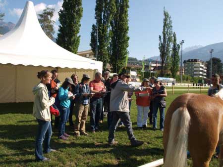 Dr. Sgambati nám detailně popsal teoretickou část lineárního hodnocení koně při zápisu do chovu, kterou jsme si vyzkoušeli druhý den v praktické části po přesunu do Merana. Od časných hodin se tam konal svod klisen a během dvou dnů museli hodnotitelé změřit a zapsat na 150 tříletých klisen. Každá jednotlivkyně byla změřena na tvrdém povrchu, následně předvedena na ruce na trojúhelníku s travnatým podkladem a poslední částí byla ukázka pohybu ve volnosti. Po té byla klisně udělena známka za typ, harmonii, končetiny, krok a klus a zařazení do třídy IA, IB, IIA, IIB, nebo III. Během těchto dnů, pro praktickou část, se k nám připojila skupina školících se posuzovatelů ze Švýcarska a všechny nás pod svá křídla vzal komisař Dr. H. Breitenberger, který na jednotlivých klisnách názorně ukazoval a trpělivě vysvětloval udělené dílčí a celkové známky. Následně jsme si vyzkoušeli samostatně zapsat klisnu a výsledek porovnat s jeho hodnocením. Po dvoudenním maratónu byla valná většina klisen zapsána do II a III třídy, naopak žádná neměla tu čest dosáhnout na skupinu IA – superelita, a tak do nedělního finále postoupilo 29 elitních IB šťastlivkyň. Za velké divácké podpory bylo metodou vybráno sedm klisen, které byly v nejužším finále a vítězkou mezi nimise stala S-Rivalin po otci Wintersturm. Ostatně ze všech 29 finalistek bylo 11 z linie W. Nutno podotknout, že naše závěrečné hodnocení se nám podařilo s malými odchylkami trefit téměř přesně.