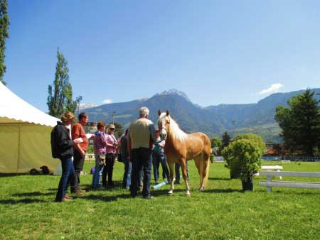V sobotním mezičase jsme navštívili Jenesien, malou vesničku nad Meranem, a to konkrétně velkou stáj rodiny Oberkoflerových. Na šedesát haflingů tam žije v krásném vysokohorském prostředí v a reálu s velkou jízdárnou, kolotočem a kruhovkou, přičemž mladá roční a dvouletá hříbata jsou od května do října vypuštěna na rozsáhlé horské pastviny. Pan Oberkofler nám předvedl pronajatého plemenného hřebce Alex-S (o: Antiss) a dále poklad stáje plemeníka Nissana (o: Navarro), který mimo jiné sklidil úspěch čtvrtým místem na körungu v Meranu 2009.