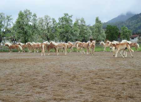 Itálii jsme opustili s pozitivními dojmy a mnoha motivačními informacemi a mířili jsme do Rakouska. Cestou jsme navštívili chov prezidenta HWZSV – L. Scheibera v Oberguglu. Ve vysoké nadmořské výšce sahající až k 1900 m. n. m má základní stádo pouze elitních klisen. Ač jsou všechny chovné, přesto poctivě pracují v zápřeži i pod sedlem až do vysokého stádia březosti, čímž dokazují velkou odolnost plemene. Pan Scheiber nás v krátkosti seznámil se způsobem chovu v Rakousku. Byli jsme trochu překvapeni z rozdílu ve způsobu vedení chovu oproti Itálii. Je více centralizovaný, povinně se prověřují všichni elitní jedinci zkouškami výkonnosti a mladí odchovanci jsou selektováni podle přísných kritérií. Komise hodnotí hřebečky už v 6 měsících věku a zhruba 30 jedinců je vybráno na centrální odchov do Ebbsu. Každoročně zvíře prochází posouzením a případnou selekcí, čili až dovrší tří let věku, je hodnoceno už popáté na vlastním körungu. Zároveň jsou sledovány znaky dané otcem, jež v případě četného předávání negativních znaků je taktéž vyselektován. Tím pro mladého hřebce ani po úspěšném uchovnění není jisté, že bude plemeníkem navěky.