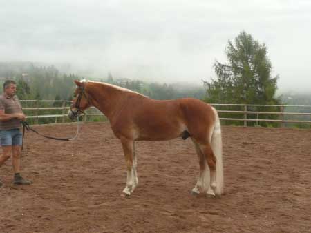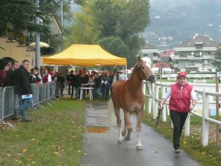 První den byl program věnován celodennímu školení, které proběhlo v sídle chovatelských svazů v Bolzanu. Velmi zajímavou prezentaci měla pro nás připravenou osoba pro chov haflinů v Itálii nejzasvěcenější, Dr. Andrea Sgambati. V úvodu své přednášky nás Dr. Sgambati seznámil s historií chovu haflingů v Itálii. Člověk by řekl, že stokrát omílaná věc se mohla vypustit, jenže právě tato část byla pro české chovatele asi nejpřekvapivější z celého dne. Prezentace byla doplněna řadou fotografií z rané fáze chovu, a pokud opomeneme ještě neustálenou barvu srsti a žíní, tak na nás ze sto let starých fotografií koukal „moderní typ haflinga“. Ještě na obrázcích z 50. let minulého století byli haflingové malí koně spíš teplokrevného typu s ušlechtilou hlavou. Dr. Sgambati nám několikrát zdůraznil, že hafling je plemeno orientálního původu a s chladnokrevníkem nemá zhola nic společného. Tak kde se vzalo to přesvědčení, že hafling (zejména takzvaný starší typ) je malý chladnokrevník? Vysvětlení pana doktora přišlo záhy. V 60. letech minulého století se objevilo v Itálii pro haflingy nové ekonomické využití – chov na maso. Potřeba koní v zemědělství neustále klesala, hobby využití ještě nebylo tolik rozšířené jako dnes, bylo nedlouho po válce a stále ještě chyběly potraviny – využití koní na maso bylo tedy logickým krokem. Konstituce plemene se tomu za několik generací přizpůsobila, díky výběru vhodně zmasilých jedinců do plemenitby. Fotografie z této doby už jasně odpovídají onomu „staršímu typu haflinga“, tzn. malého chladnokrevníka zlaté barvy s bílou hřívou, jak ho zná značná část českých chovatelů. Naštěstí v 80. letech značně klesla cena koňského masa a chov haflinga se tak mohl začít vracet zpět tam, odkud vzešel. Tzn. k malému ušlechtilému koni pro univerzální využití, v dnešní době především pro jezdectví. Tlustou čáru za minulostí udělal italský svaz v roce 1990, kdy provedl revizi hřebců, změnil se šlechtitelský program, lineární hodnocení a začalo se pracovat s genetickým hodnocením. Výsledek téměř 25 leté práce svazu a chovatelů samotných jsme mohli vidět hned druhý den na körungu hřebců.