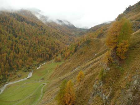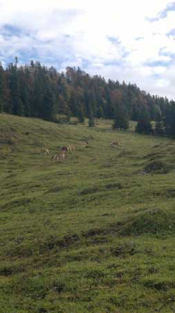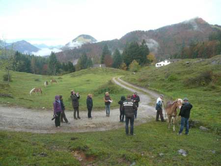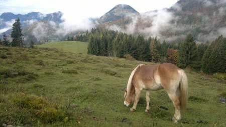 Těsně před naším odjezdem do ČR jsme ještě stihli návštěvu vysokohorských almů (přes 1.150 m. n. m.), kde sezónu od května do října tráví odchovávaní hřebečci. V ročníku 2012 a 2013 je jich nyní celkem 34 a tvoří jednu velkou skupinu – výhodou je, že dvouletí hřebci vždy pro ty mladší fungují jako učitelé. Spodní pastvina, kde jsou hřebci na jaře a na podzim má 28 hektarů, horní pastvina, kam se přesouvají na léto má dalších 120 ha. Kromě zdrojů vody zde hřebci nepotřebují vůbec žádnou péči, jen občasnou kontrolu „pastevcem“ – starším pánem, dříve rovněž chovatelem haflingů (a mimochodem chovatelem u nás působícího Avalona), který zde s hřebečky tráví sezónu.