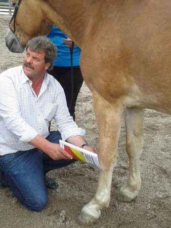 Po změření a předvedení hřebců na tvrdém podkladu přišla na řadu další část, předvedení v trojúhelníku na travnatém povrchu. Komise nejprve zhodnotila několik hřebců společně, aby se členové sjednotili v hodnocení, poté se rozdělila k jednotlivým trojúhelníkům. To už se nás ujal Dr. Botte a připojila se k nám i skupinka ze Švýcarska. Po stručném úvodu jsme si pod jeho pečlivým vedením zkoušeli sami hodnotit jednotlivé hřebce, vyplňovali lineární popisy a občas zápasili s německými a italskými pojmy. Když nám nebylo něco jasné, neváhal vzít stranou nějakého hřebce a vše se snažil názorně ukázat.