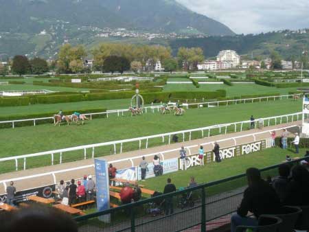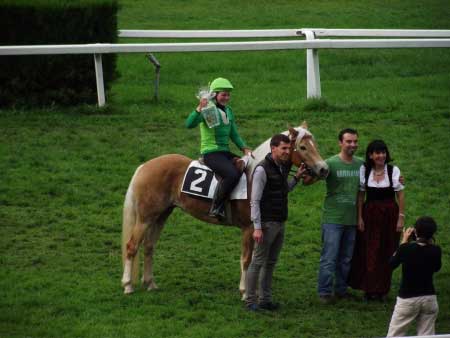 Po oficiálním ukončení körungu pokračoval program na závodišti dostihovým dnem haflingů, kde bylo nachystáno celkem osm dostihů pro věkové kategorie 3 letých klisen, 4 letých klisen a 5 letých a starších klisen, kde startovala i klisna, která je už dvanáctiletá! Diváků na dostihové odpoledne značně přibylo, sázky byly vysoké, a tak se část výpravy nechala možností sledovat pro naše haflingy zcela netradiční sportovní disciplínu zlákat a zůstala na závodišti. Zbytek se vydal na procházku po krásném lázeňském městě Meranu.